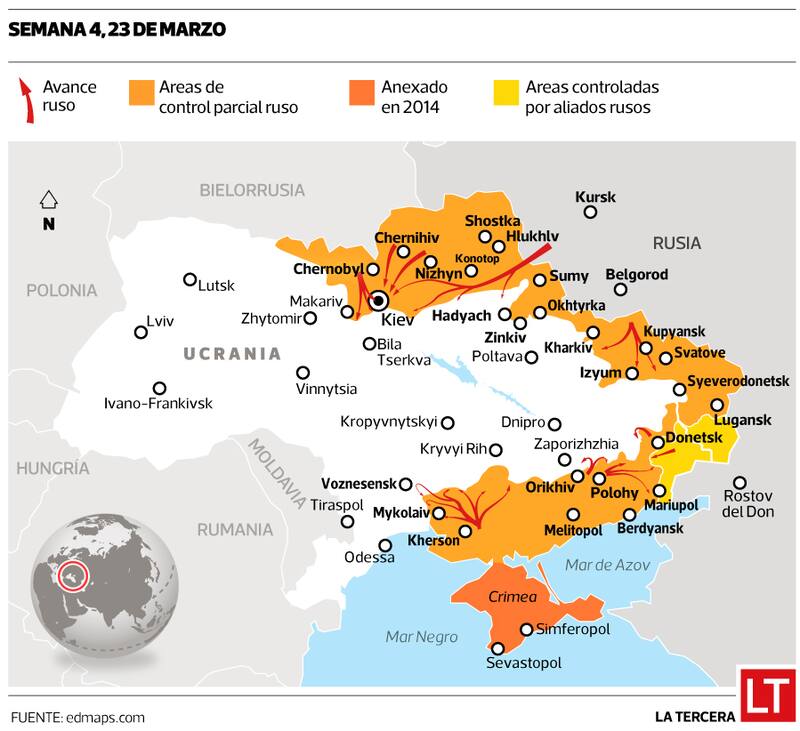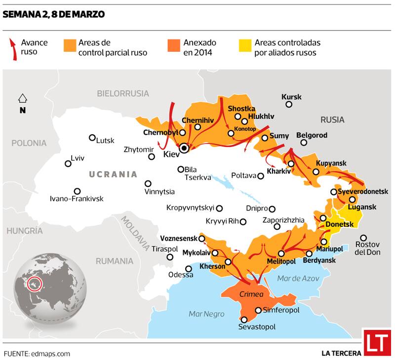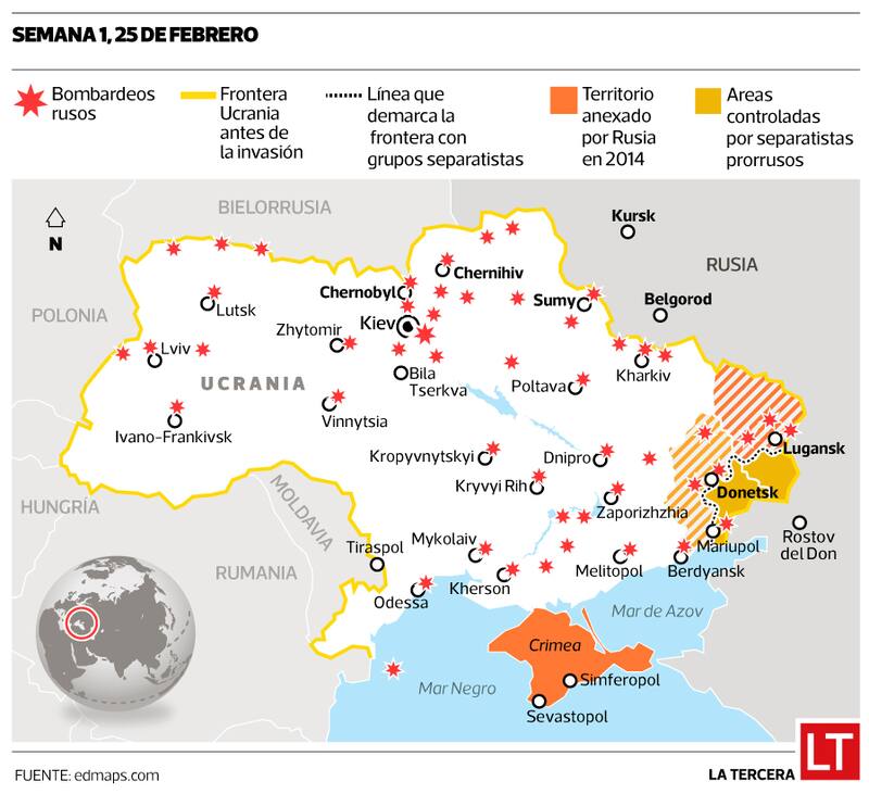 Para sorpresa de muchos, aunque no para el gobierno y la inteligencia estadounidenses -que venían advirtiendo hace días de que Vladimir Putin había tomado la decisión de invadir Ucrania-, Rusia inicia su ofensiva contra el territorio ucraniano desde el norte (por la frontera con Bielorrusia), desde el sur (a través del Mar Negro) y también por el este (vía el Donbás, la región donde se libra una guerra desde 2014). El mundo observa atónito cómo Moscú pone en marcha el mayor conflicto en Europa desde 1945.