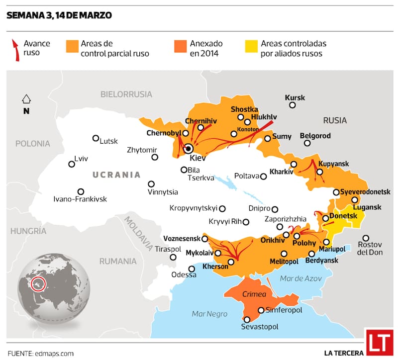 Ucrania logra contener la ofensiva rusa en el frente sur, mientras Moscú lanza un ataque contra el puerto de Mykolaiv. TikTok suspende sus servicios en Rusia y la policía arresta a más de tres mil personas en diversas protestas contra la guerra en el país.
