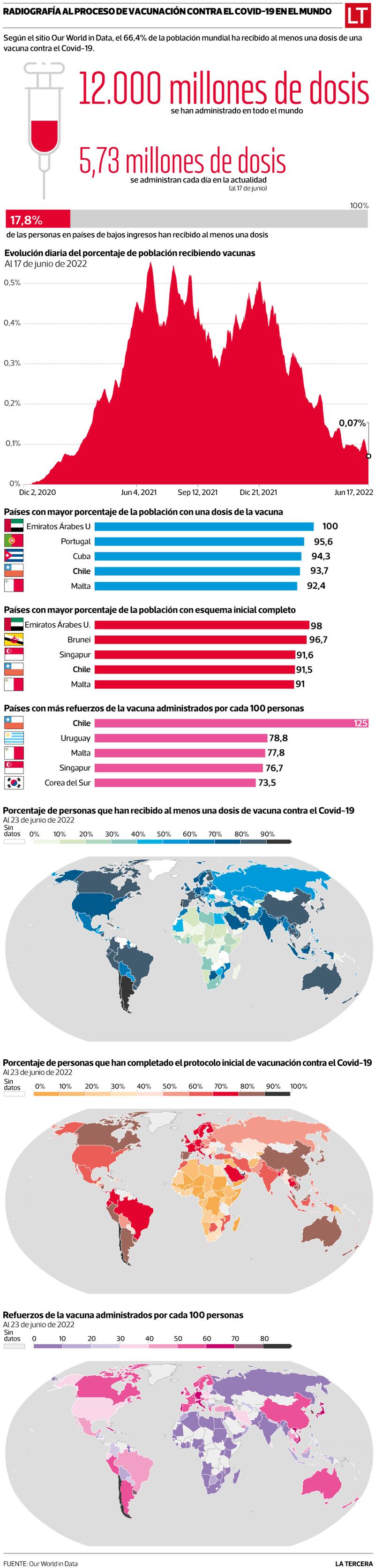En contraste a la política de vacunación a toda la población, la lista de naciones que está aplicando dosis de refuerzo a sectores clave de su población es bastante más amplia, pero tampoco es una realidad mundial. Según el portal Our World in Data, al 23 de junio solo se habían aplicado 26,6 refuerzos por cada 100 personas en el mundo. El mismo sitio señala que la aplicación diaria de las distintas dosis de la vacuna ha caído desde diciembre a la fecha, y hoy solamente se registran 5,73 millones de inoculaciones por jornada en todo el mundo.