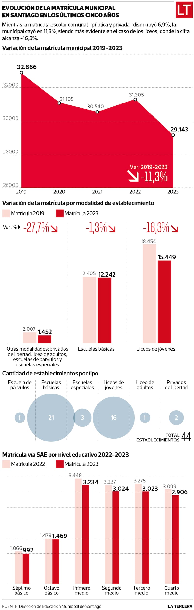 En profundidad y según aseveran desde la DEM capitalina, de acuerdo con datos del Ministerio de Educación, en el periodo 2019 (el último marzo previo al estallido) a 2023, todo el sector de educación escolar de Santiago disminuyó, en total, 6,9%, pasando de 86.127 estudiantes a 80.185 considerando todos los sectores educacionales, entre particular pagado, particular subvencionado, municipalizado y corporaciones de administración delegada.