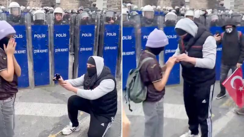 Amor encapuchado: joven propone matrimonio a su novia en plena protesta en Turquía