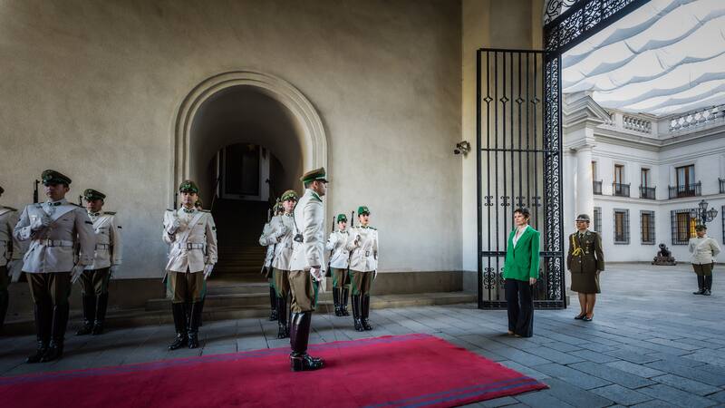 La titular de Interior recibió los honores en el Palacio de La Moneda en ausencia de la Presidente de la República Gabriel Boric, quien se encuentra de gira en Río de Janeiro, donde participa en la primera sesión de la cumbre del G20 Brasil 2024.