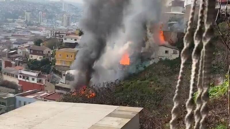 Bomberos combaten incendio que afecta al menos cinco casas en Valparaíso