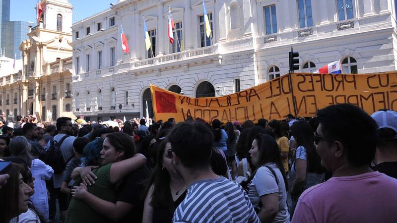 Decenas de personas se manifiestan en el centro de Santiago contra el edil de la comuna por el retraso del pago de bono de Navidad.