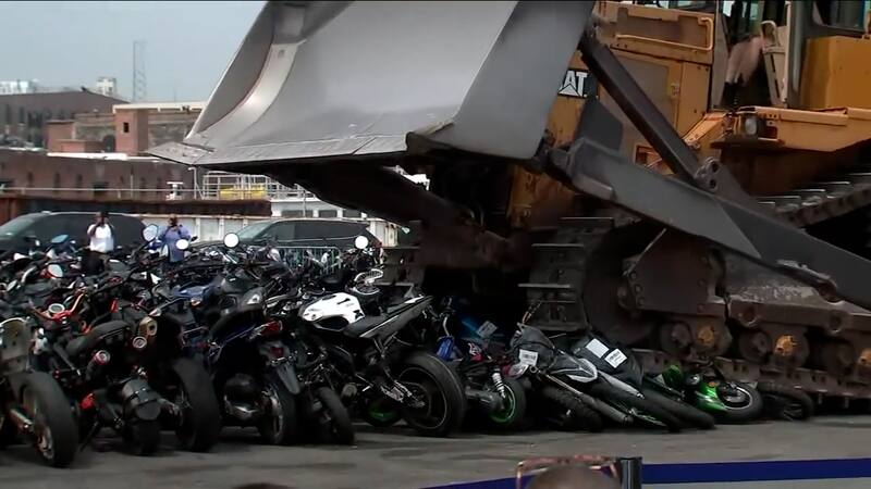 Enorme excavadora aplasta sin piedad a un centenar de motos en Nueva York