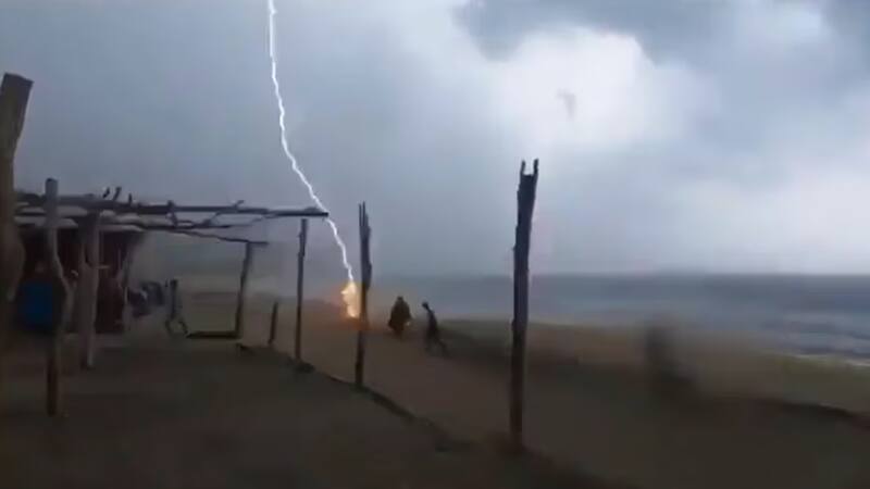El dramático registro da cuenta del momento exacto en que la descarga eléctrica cae sobre una turista y un vendedor de hamacas en medio de una tormenta en la playa de Aquila en Michoacán.