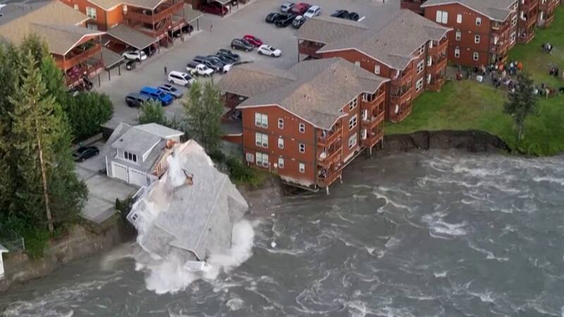 Dron capta el momento exacto en que una casa se derrumba sobre un río en Alaska