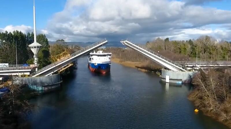 El Patagón XI, el barco transportador de peces más grande de construcción nacional, paso bajo los brazos del polémico puente levadizo, que se encuentra en reparación, pero se espera que a fines de este año esté operativo en su totalidad.