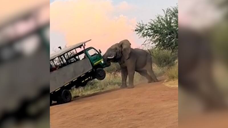 Elefante furioso golpeó violentamente un camión safari en Sudáfrica