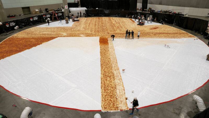 Esta megapizza se está preparando en los Angeles California y medirá más de 3 mil metros cuadrados. Los cocineros esperan repartir cerca de 68 mil rebanadas una vez que esté lista.