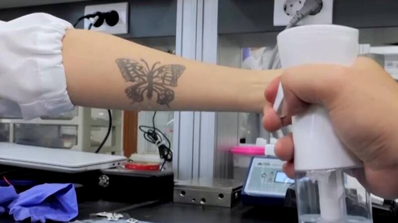 Mariposas plateadas y otros diseños dibujados en la piel con una "tinta electrónica para tatuajes" hecha de un metal líquido y nanotubos de carbono, podrían ayudar a controlar la frecuencia cardíaca y otros signos vitales de salud, según investigadores de Corea del Sur.