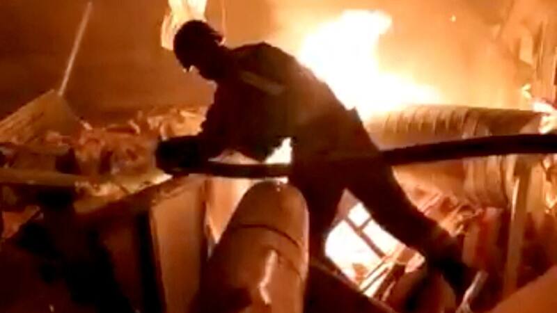 El vídeo muestra al periodista hablando cuando se produce la explosión en la pista de hockey sobre hielo Altair de Druzhkivka y posteriormente a los bomberos extinguiendo el fuego.