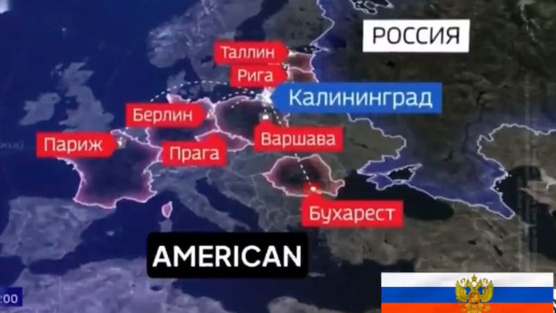 El canal estatal ruso Rossiya 1 desplegó una gráfica de un mapa en uno de sus noticieros dando cuenta de los posibles ataques con misiles a capitales europeas, donde aparecen como objetivos París, Varsovia, Berlín, Bucarest, entre otras importantes ciudades.
