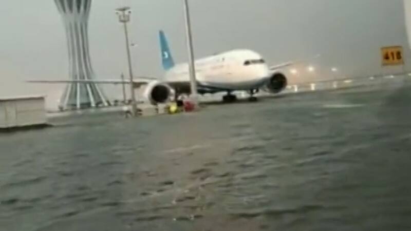 En el registro se ve el aeropuerto de Beijing convertido en verdadera piscina en medio de las graves inundaciones que hasta ahora han confirmado al menos 20 muertos.
