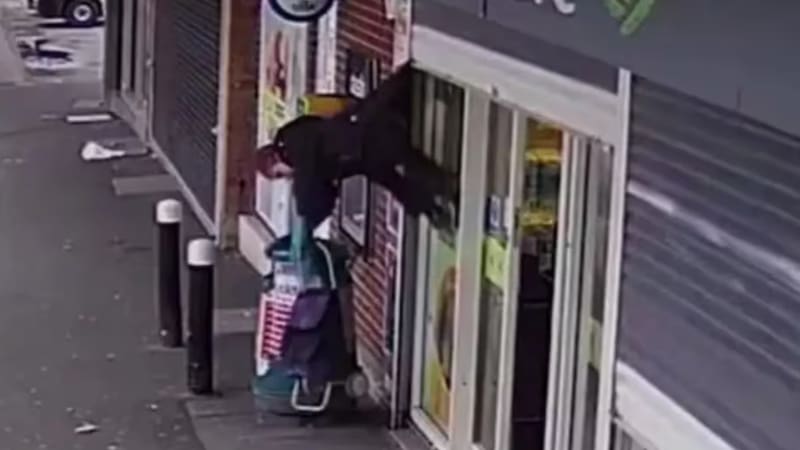 La mujer se enganchó con la persiana metálica del local en Gales, Reino Unido, y terminó colgada. El hecho, fue registrado por las cámaras de seguridad volviéndose viral en redes.