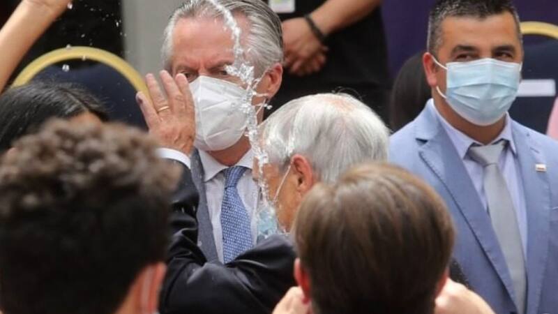 La mujer era una de las personas invitadas a la conmemoración de los 2 años de pandemia en Chile, quien al final del acto se acercó al Jefe de Estado y le tiró agua con una botella.