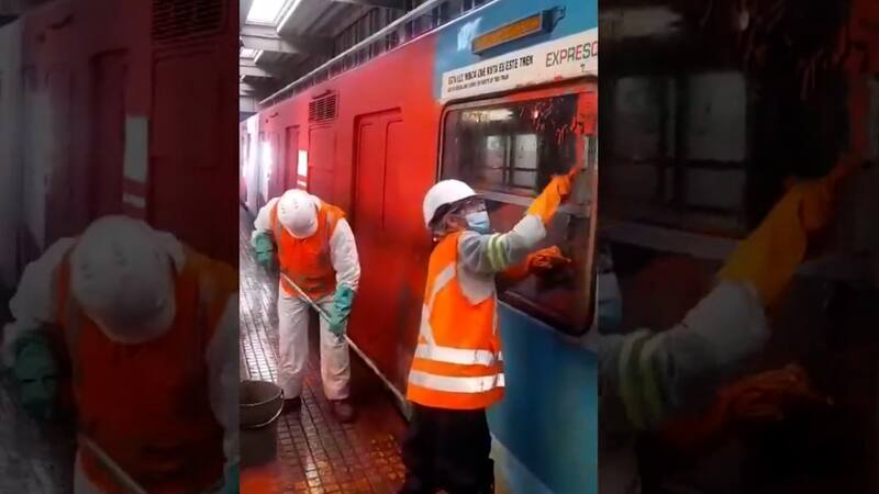 Personal de Metro de Santiago se encuentra limpiando el tren vandalizado en San Joaquín