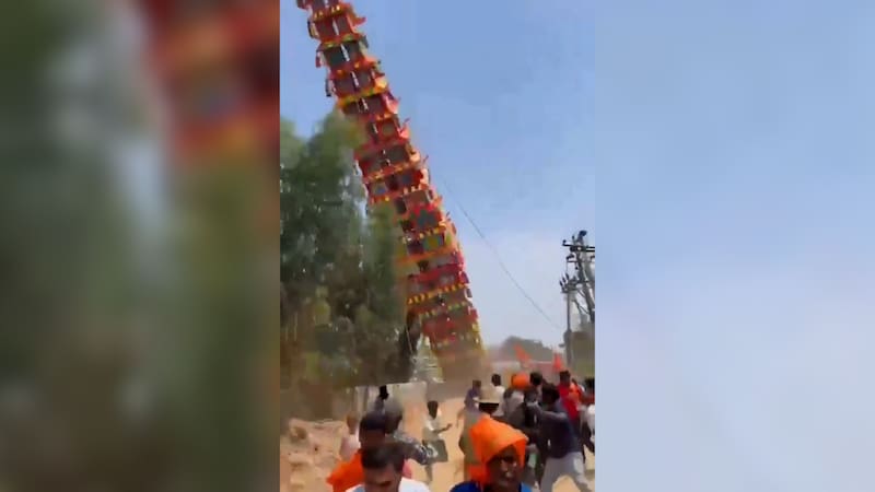 El incidente ocurrió en medio de la celebración religiosa de Madduramma Devi Jatre. La estructura estaba construida sobre una carroza, y pese al caos entre los asistentes, no se reportaron heridos.