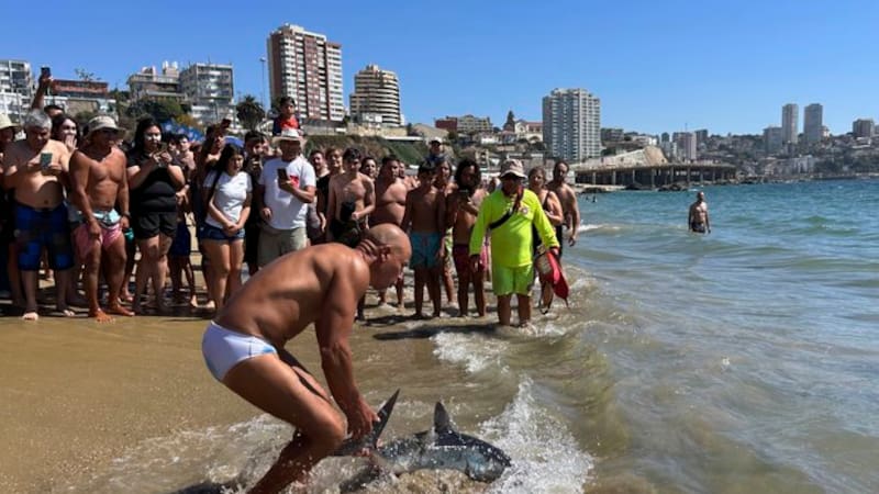 Un tiburón quedó varado en la playa Caleta Abarca, en Viña del Mar, durante la tarde del viernes 14 de febrero. La sorpresa de los presentes no se hizo esperar, quienes rodearon al animal. En medio de este escenario, un bañista —según 24 Horas, un exintegrante de la Armada— se acercó al tiburón y logró devolverlo al mar, lo que generó el aplauso de los testigos.