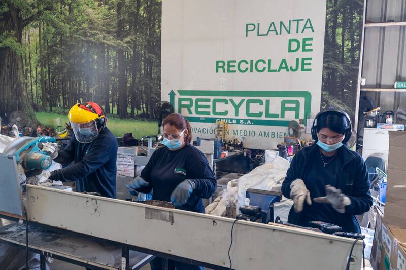 “El equipo se desarma de forma manual”, explica Carolai Puga, encargada de Sistema de Gestión Ambiental de Recycla Chile: “Se va desarmando uno a uno para recuperar sus componentes, ya sea toda la carcasa externa, que generalmente es de ABS, policarbonato o poliestireno, como los componentes internos: la tarjeta electrónica, algunos metales y la misma pantalla”.