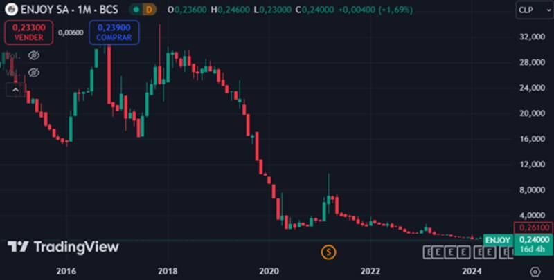 Para tener una idea, solo entre los años 2023 y 2024, Enyoy reportó pérdidas totales por más de 170 millones de dólares. Sumado al hecho de que las acciones de ENJOY SA en la Bolsa de Santiago, han sufrido un desplome continuo desde el año 2018, perdiendo más del 90% de su valor hasta el momento.