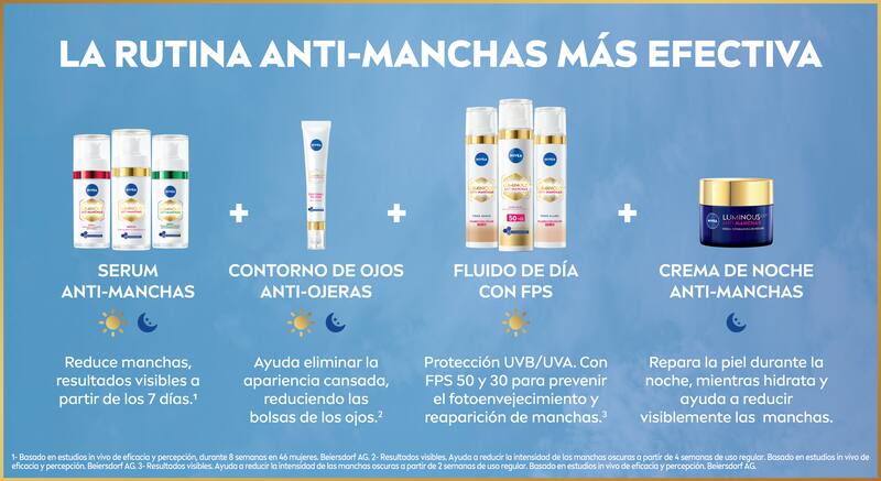 “El protector solar no es solo para el verano; hay que seguir usándolo en otoño e invierno para prevenir manchas y envejecimiento”, enfatiza el dermatólogo. Por esta razón, la línea Luminous630® Anti-Manchas de NIVEA incorpora el Fluido de Día con FPS 50, que protege la piel y evita que las manchas vuelvan a intensificarse⁸. “La clave está en la constancia y en el uso adecuado de los productos, aplicando productos con protector solar de alto espectro varias veces al día y combinándolo con una hidratación intensiva”, agrega el doctor Tabilo.