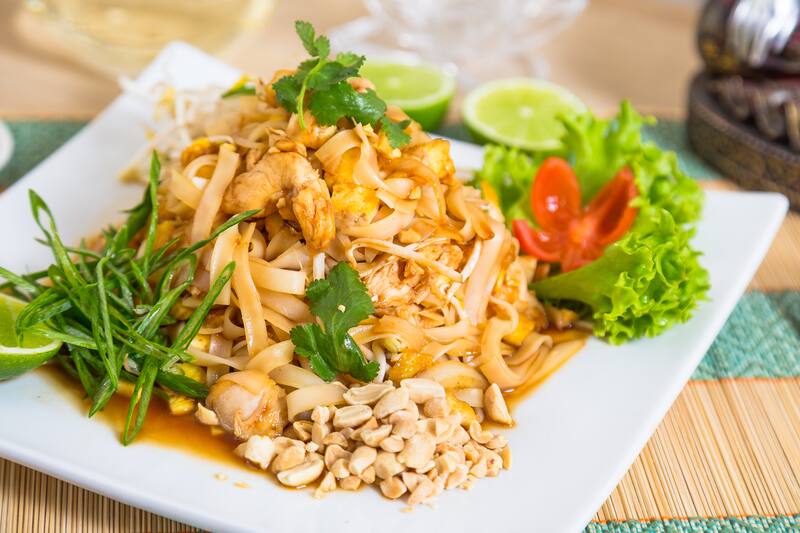 Su plato más típico es el famoso pad thai, que son fideos de arroz salteados en una salsa dulce y salada, mezclados con trozos de tofu, diente de dragón, pollo y camarones, con un poco de maní molido encima. Se come rociando un poco de jugo de limón encima para darle la acidez y frescura que necesita.