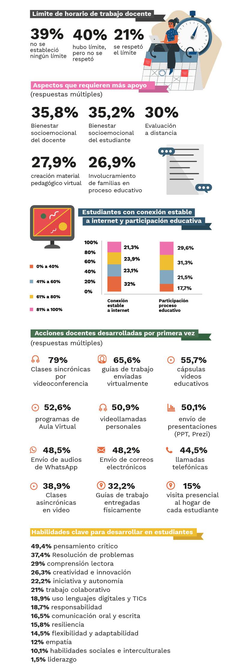 “Este estudio planteó desafíos en caso de mantener un sistema híbrido, con clases presenciales y remotas. En esta línea, cinco de cada 10 maestros declararon que el 55 por ciento de sus estudiantes tuvo baja o inestable conectividad, afectando su participación en los procesos de enseñanza”, sostiene Walker.