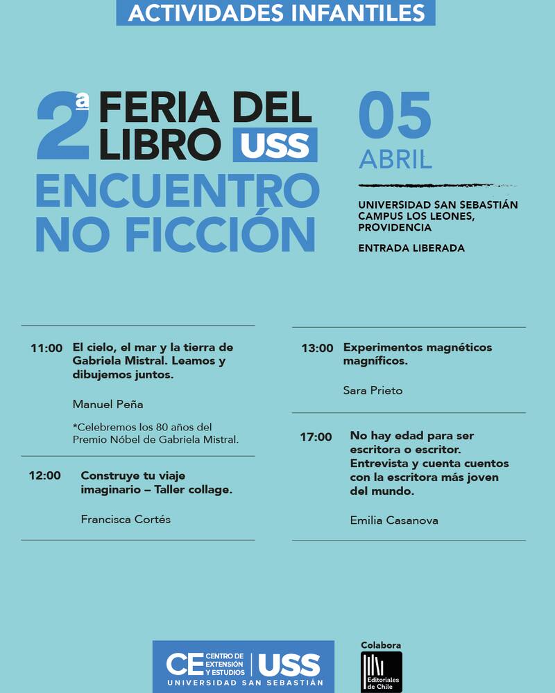 El evento gratuito se desarrollará entre el 3 y 5 de abril en el Campus Los Leones de la USS. La cita tiene como invitada especial a la escritora y guionista argentina Josefina Licitra, el periodista e investigador Álvaro Matus y Catalina Castro, protagonista del programa “21 días” de TVN, entre otros. Los niños podrán conocer a la escritora e ilustradora más joven de Chile, Emilia Casanova, y conmemorar los 80 años del Nobel de Literatura de Gabriela Mistral.