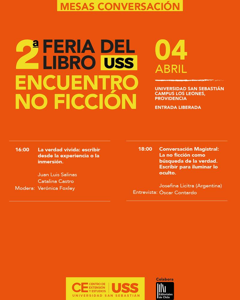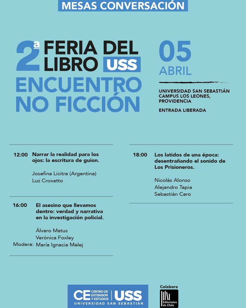 La Feria del Libro USS - Encuentro de No Ficción, se celebrará del jueves 3 al sábado 5 de abril en el Campus Los Leones de la Universidad San Sebastián (USS), en el corazón de Providencia, ofrecerá una serie de mesas de autor que explorarán temas fascinantes y profundos, como la forma de escribir sobre la mente de un criminal sin glorificar el delito, y cómo la no ficción puede ser una poderosa herramienta para desvelar historias desconocidas y dar voz a lo que rara vez se explicita.