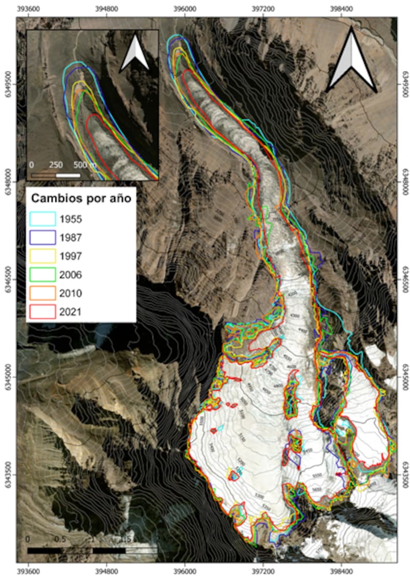 La alerta se produce cuando se identifica que, desde 2010 a la fecha, la pérdida de área glaciar alcanzó 1,4 km2, lo que significa una reducción relativa del 17,5% de la cobertura glaciar si se utiliza como referencia el año 1955.