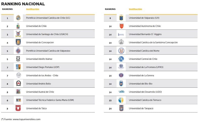 A nivel nacional, en esta versión, figuran 24 casas de estudio, cuatro más que en 2021. Las precursoras fueron: la Católica, de Chile, de Santiago de Chile, de Concepción, Católica de Valparaíso, Adolfo Ibáñez, Austral de Chile, de los Andes, de Talca y Diego Portales, Santa María, Andrés Bello, de La Frontera y de Valparaíso.