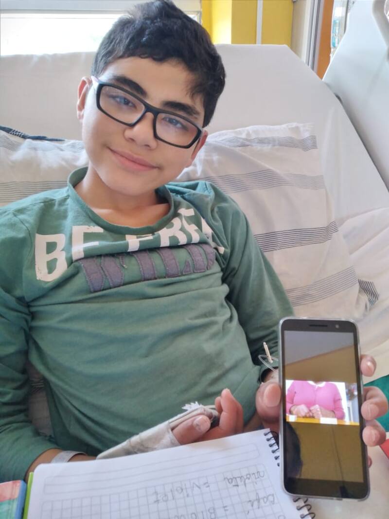 Con el objetivo de que los niños puedan conectarse fácilmente a sus clases y con sus familias en caso de que estén hospitalizados, la empresa de telecomunicaciones Entel donó a la Fundación Nuestros Hijos 70 chips con planes de internet, que garantizan conexiones estables y gratuitas para los menores. A Juan José le sirvió para conectarse a las clases y estar en contacto con su papá, su abuela y hasta con sus hermanos mientras estaba en Santiago. Ahora, ya de vuelta en San Fernando, disfruta de conectarse a su clase favorita, Matemática, desde su casa.