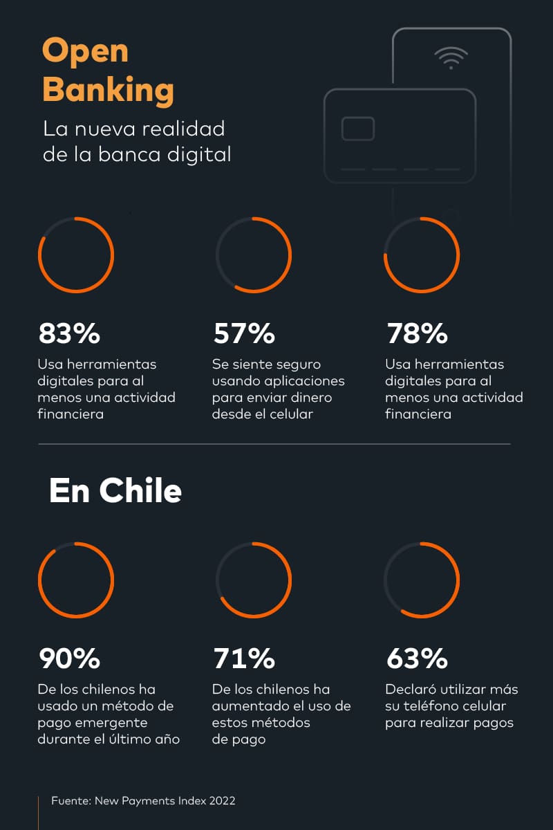 En nuestro país, la masificación de nuevas aplicaciones de pago, ahorro e inversiones está empezando a generar un hábito en torno al Open Banking. De hecho, el New Payment Index 2022 señala que 9 de cada 10 chilenos ha usado un método de pago emergente durante el último año y 6 de ellos al menos lo han hecho con tres tecnologías diferentes. Un perfil mucho más adelantado que el de la región, donde solo un 43% dice haber usado su dispositivo portátil para realizar pagos, cifra que en Chile llega al 63%.