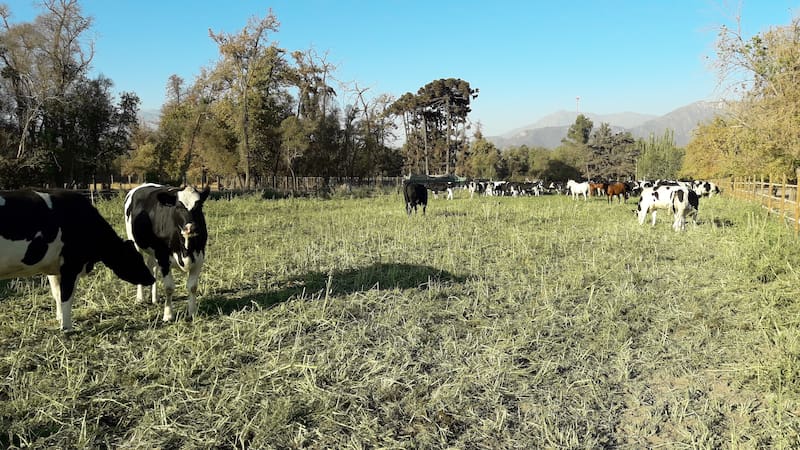 El centro para la ganadería regenerativa de Pirque está dentro de un campo que se usa para la producción de leche. Una de las actividades que tiene es la producción de maíz de ensilaje, con la que se alimenta a las vacas de la lechería. Rafael Larraín detalla que lo que han hecho durante este año es cambiar el sistema convencional de producción de maíz por uno regenerativo. Para eso, utilizan cultivos invernales y prueban distintas combinaciones de ellos con siembra directa, sin dar vuelta el suelo.
