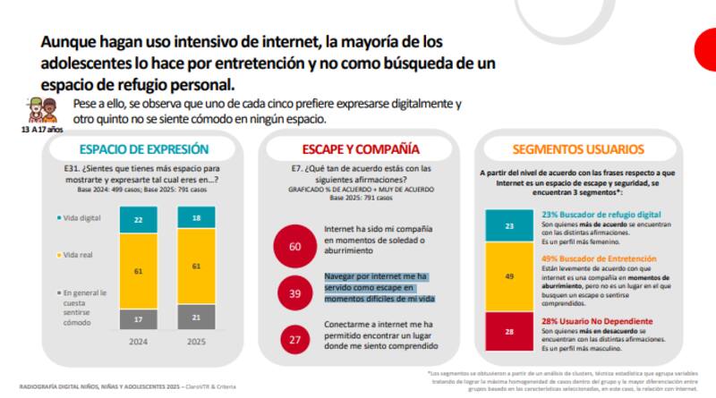 La octava versión de este estudio, realizado por Claro junto a Criteria Research, entrega reveladores datos sobre cómo internet, las RR.SS. y la inteligencia artificial ya son parte fundamental de la vida de los chilenos entre 8 y 17 años: un 58% usa la IA para hacer tareas, y la mitad de los adolescentes han sido víctimas o victimarios de ciberacoso. Aquí, una guía para entender las cifras, "que buscan generar a nivel familiar y de sociedad una conversación reflexiva sobre cómo los niños usan la tecnología y cómo los adultos podemos acompañarlos en el proceso", dice Cyntia Soto, gerenta de Sostenibilidad de Claro VTR.