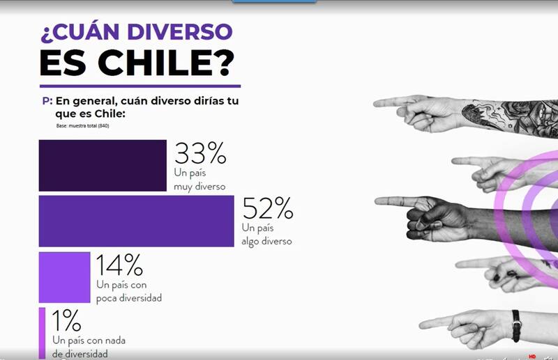 Cristian Valdivieso, director de Criteria, sostuvo que el 88 por ciento de la población afirma que Chile en los últimos 20 años es un país más diverso, en tanto que solo el 10 por ciento afirmó que no ha habido cambios, y el 2 por ciento que es menos diverso. No obstante, según Valdivieso, “existe una suerte de ambivalencia, puesto que el 48 por ciento dijo que esta mayor diversidad a la vez era positiva y negativa; y el 41 por ciento que era positiva; un 8 por ciento que era negativa, en tanto que 3 por ciento se inclinó por la opción ni positiva ni negativa”.
