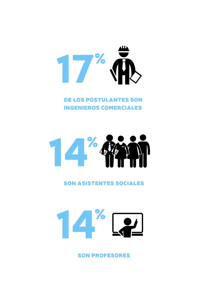 En la Radiografía también se integró el tema de la Profesión u oficio de los candidatos que pasaron a segunda vuelta y los electos en primera. Entre ellos, se produce un fenómeno de gran diversidad de profesiones u oficios, llegando a 13, entre los que hay abogados, arquitectos, profesores, periodistas, ingenieros, médicos, sociólogos, asistente social, entre otros. “Los candidatos vienen de todos lados. No hay dos o tres profesiones realmente llamativas, sino que hay gran variedad. Eso habla de una sociedad que cada vez menos tiene ideas preconcebidas acerca de quién debe ser candidato. Antes los abogados, médicos e ingenieros tenían mayor propensión y ahora eso cambió y se abre la cancha política”, explica Gonzalo Valdés.