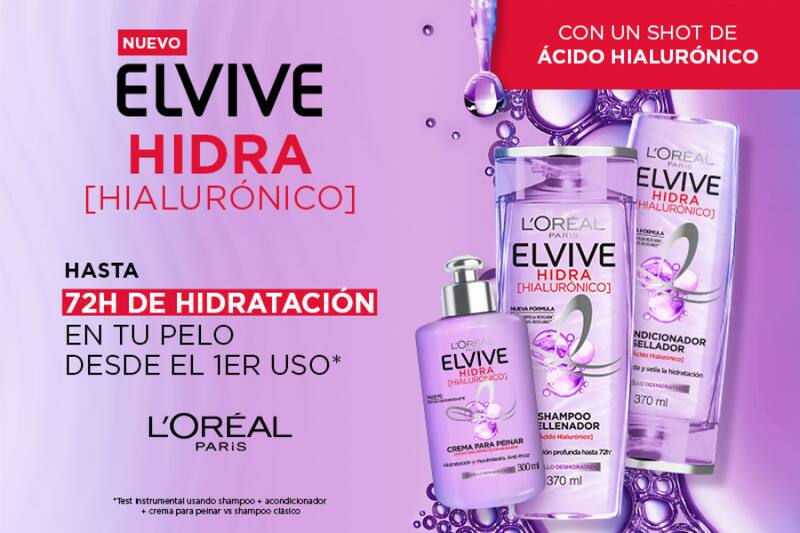 Conclusión: Elvive Hidra Hialurónico y su fórmula con Ácido Hialurónico y efecto Anti-Sal, recarga y rellena la fibra para una transformación instantánea. Con una hidratación intensa hasta por 72 horas.