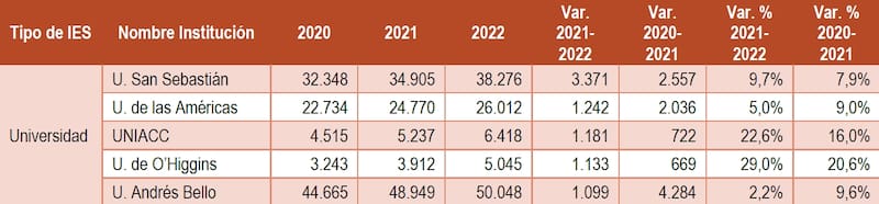 Un informe del Consejo Nacional de Educación Superior ubicó a las universidades San Sebastián, Andrés Bello y de las Américas, como las principales casas de estudios, al inscribir a 115 mil estudiantes este año.