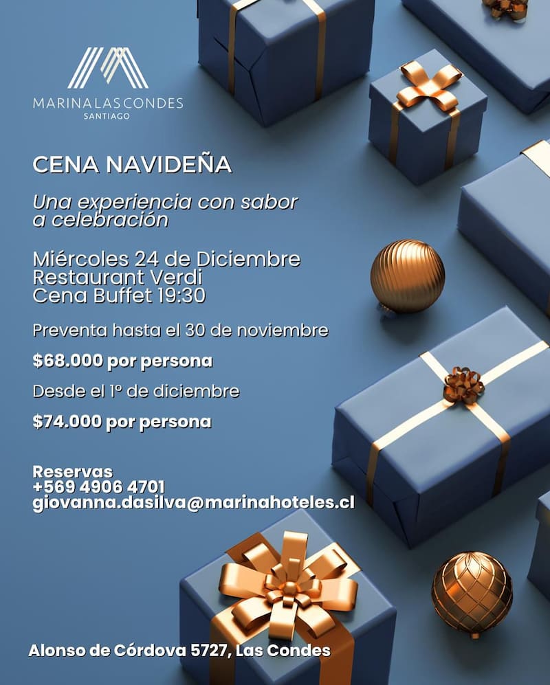 El 24 de diciembre, el Restaurant Verdi del hotel Marina Las Condes invita a vivir una cena buffet navideña pensada para compartir en familia. Los suscriptores de La Tercera tienen un 20% de descuento presentando su credencial virtual vigente.