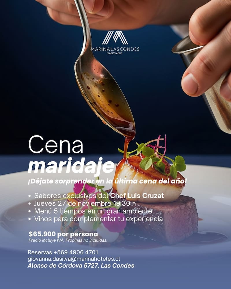 El último jueves de noviembre, el hotel Marina Las Condes presenta una cena de fin de ciclo con sabores creados por el chef Luis Cruzat y una selección especial de Armonia Wines. Los suscriptores de La Tercera obtienen un 20% de descuento presentando su credencial virtual vigente.