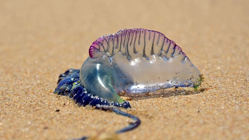 La fragata portuguesa se reconoce por su coloración azul violácea, un flotador superficial que puede alcanzar los 20 centímetros y largos tentáculos que pueden extenderse varios metros. No se trata de una medusa propiamente tal, sino de una colonia de organismos especializados que actúan de forma coordinada. El principal problema radica en sus tentáculos, los cuales contienen nematocistos capaces de inyectar toxinas al mínimo contacto con la piel.