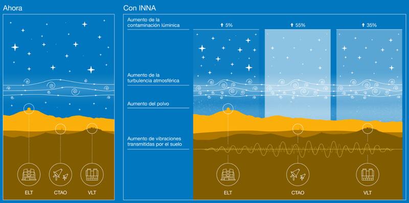 Los estudios realizados por ESO indican que, para minimizar los efectos negativos, estos proyectos deberían estar a mínimo 50 kilómetros de distancia, idealmente a 100 kilómetros. En respuesta a estas inquietudes, a finales de febrero el Ministerio del Medio Ambiente de Chile ha solicitado reevaluar la ubicación del proyecto INNA, señalando deficiencias en la justificación del proyecto y posibles incumplimientos de normas de contaminación lumínica.