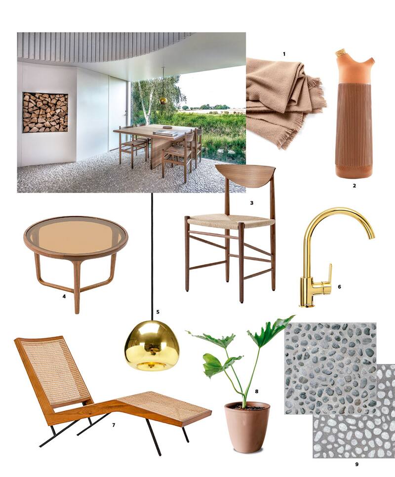 1. Manta mono color Milk Tea, Hay, $99.500 (klappdesign.com) 2. Garrafa Junto, diseño de Nicholai Wiig Hansen para Normann CPH, $42.900 (klappdesign.com) 3. Silla familia Drawn, diseño de Peter Hvidt y Orla Mølgaard-Nielsen para &Tradition, consultar precio (interdesign.cl) 4. Mesa centro posh, chica, cristal café, $199.900 (surdiseno.cl) 5. Lámpara de suspensión familia Void, diseño de Tom Dixon, consultar precio (interdesign.cl) 6. Grifería monomando lavaplatos, terminación oro Atacama, línea Arona, $69.990 (stretto.cl) 7. Reposera Bonn, nogal y rattannatural barnizado, $499.900 (surdiseno.cl) 8. Filodendro paraguayo, $22.900 (nudonativo.cl) 9. Porcelanato Risseu: Con look de canto rodado, rectificado y terminación Natural R10, este revestimiento de 60 x 60 cm y 9 mm de espesor resulta idóneo para pisos y muros que buscan afinidad con el paisaje natural. Marca REFIN, Italia. Consultar precio (atika.cl).