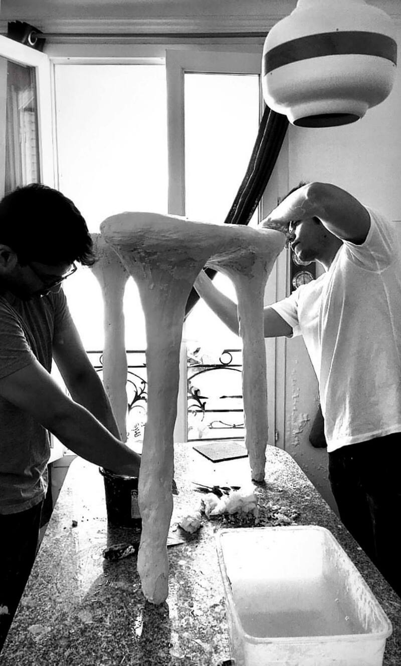 En plena época de confinamientos en Europa recibió otro mensaje. Una galería llamada Scène Ouverte no podía esperar a que terminara la cuarentena para ver su obra. David ya había vuelto a Chile. “La vida a veces hace que te encuentres con gente simpática, gentil, que te da oportunidades. Una señora con la que había hecho un curso me permitió arrendar un taller al lado del suyo, a un precio que aquí en París es imposible. La galerista fue a ese taller y le encantaron la mesa, el taburete y todo el trabajo que habíamos hecho con David. Con ella expusimos en el Grand Palais en septiembre, en una feria que se llama Art Paris. Íbamos a otras muestras de diseño, pero todo se está cancelando por el Covid. Aquí es donde entra una galería que realmente dice ‘vamos a fabricar algunas piezas de esta colección en bronce como escultura final’. El yeso es bonito pero muy frágil. Para mí ese es un gran paso como diseñador, como creador”.