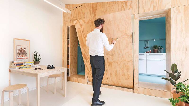 A la hora de almuerzo el escritorio puede ser comedor y por la tarde noche puedes invitar amigos, hacer una pequeña fiesta, porque caben perfectamente. Si alguien quiere quedarse a dormir, también alcanza el espacio gracias este sistema de diván mitad empotrado en la pared, que puede sacarse –sin atestar la casa– para volverse cama.