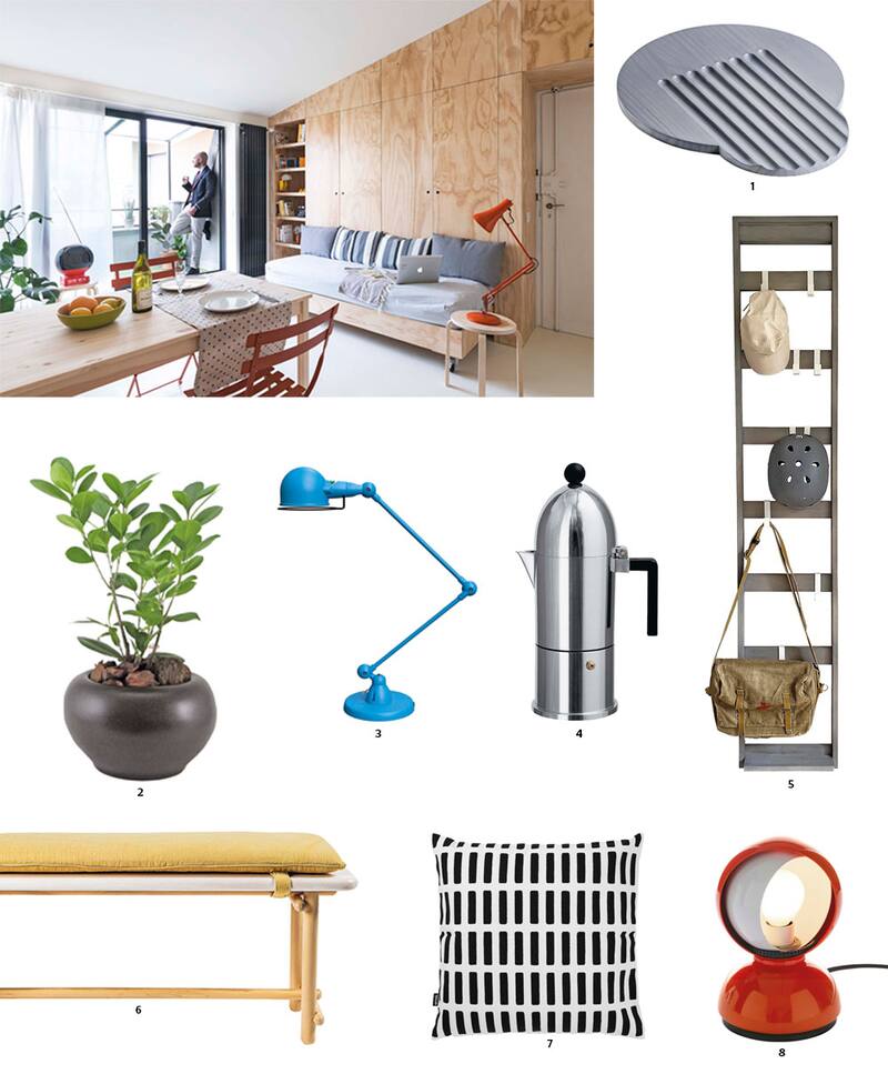 1. Tabla Eda azul, $39.990 (@caballodebatalla) 2. Ficus Moclame Ma 7, $45.000 (@decoplantas) 3. Lámpara de mesa Jieldé, consultar precio (@metrocuadrado_m2) 4. Cafetera La Cupola 9095, diseño de Aldo Rossi para Alessi, $74.000 (@dissimilar.cl) 5. PERCHERO PINO L GRIS: Mantener ordenado lo que necesitamos a mano es el fin de esta pieza. Su impronta es la simpleza y cómo cada uno puede personalizar la distribución de las perchas. Fabricado en madera de pino, tarugada para no ver ningún tornillo, y con perchas metálicas en pintura electroestática blanco mate, muy firmes a la hora de colgar algo en ellas, $175.000 (@takdiseno) 6. Banca Prima, medidas desde 90 x 37 x 45 cm, $250.000 (@primamuebles) 7. Cojín Siena, diseño de Alvar Aalto para Artek, $25.600 (@dissimilar.cl) 8. Lámpara Eclisse, diseño de Vico Magistretti para Artemide, consultar precio (@dissimilar.cl).