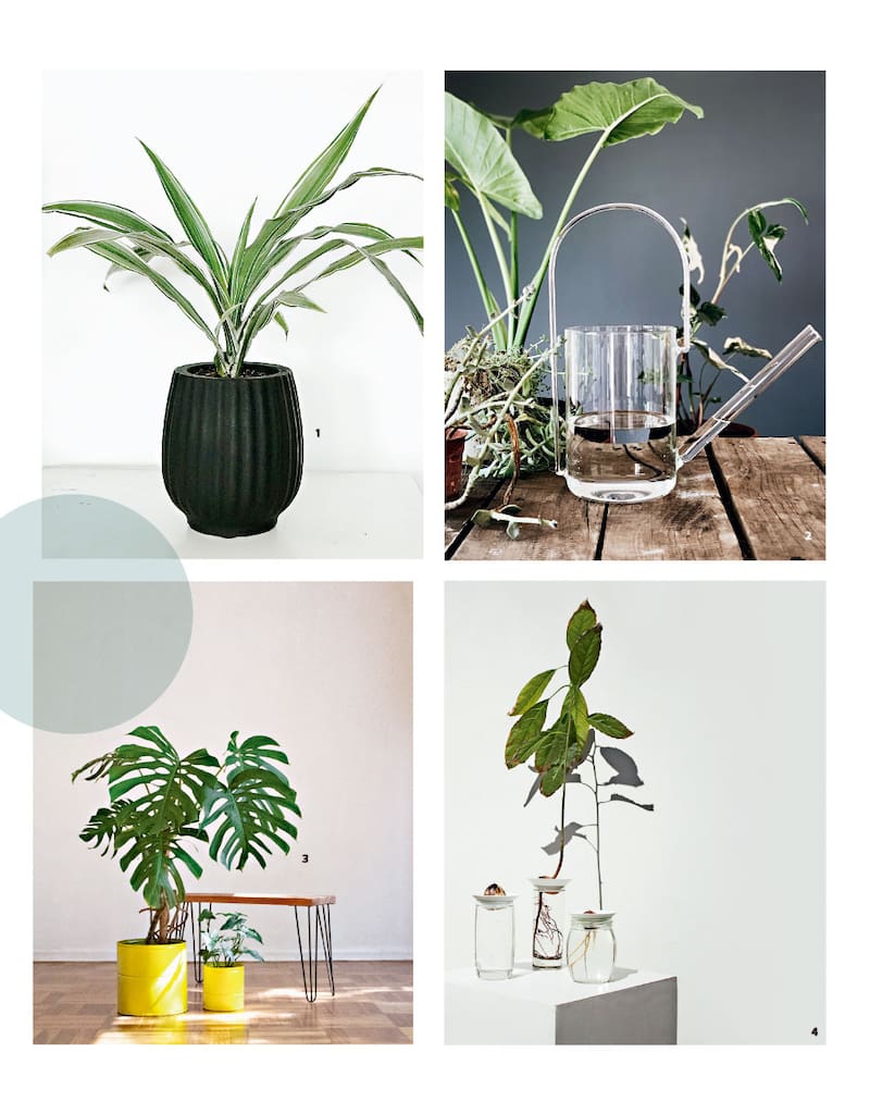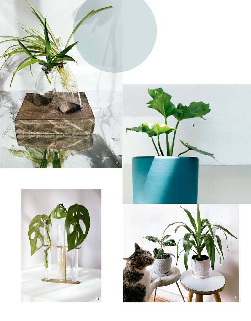1. Maceta Amants con planta Chloropytum, $24.990 (Cementa Verde) 2. Filodendro paraguayo, en macetero, 20 x 20 cm, con plato, $23.000 (Dam Garden) 3. Estación de propagación, $8.500 (Hyiedra) 4. Afelandra y yuca, ambas en maceta estrella, con plato, $19.900 c/u (Objeto Vivo).