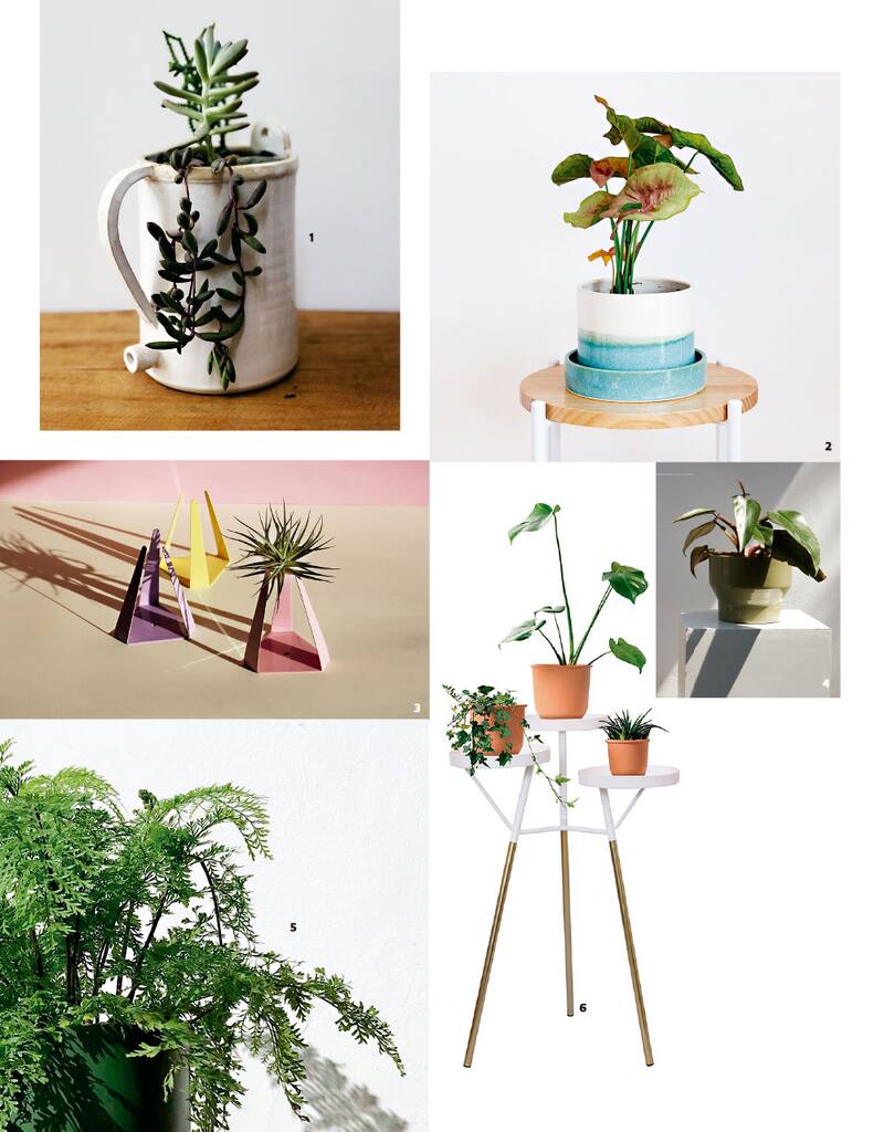 1. Othonna capensis, en maceta de cerámica gres, para colgar o poner sobre superficies, $28.000 (Taller Andrea Gacitúa Cerámica) 2. Singonio en macetero Sahne, $29.990 (Rubus) 3. Pedestales triangulares con Tillandsia, $17.000 (The Plant Store) 4. Filodendro erubescens, $8.000; macetero, $23.200 (Hyiedra) 5. Helecho zanahoria, 45 cm de alto, incluye macetero, $35.000 (Concepto Sombra) 6. Soporte para macetas, $29.990 (La Sillería).